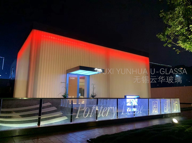 選用無錫云華K25*90*8超白香梨紋噴砂U型玻璃, 約7.6米